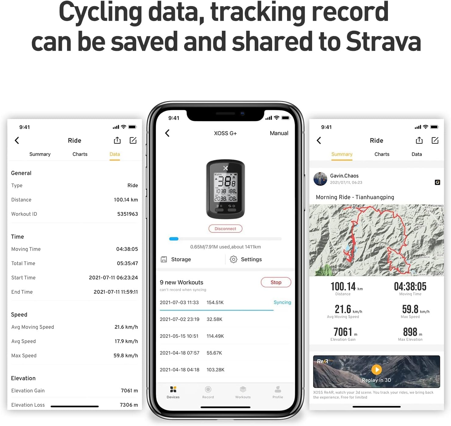 Sincronización con STRAVA y Free ReAR, la aplicación profesional de ciclismo XOSS para montar en bicicleta admite la carga de entrenamientos a través de Bluetooth y la sincronización con Strava al mismo tiempo, lo que facilita compartir su paseo. También puede compartir sus entrenamientos en 3D con sus amigos a través de la APLICACIÓN XOSS de forma gratuita.