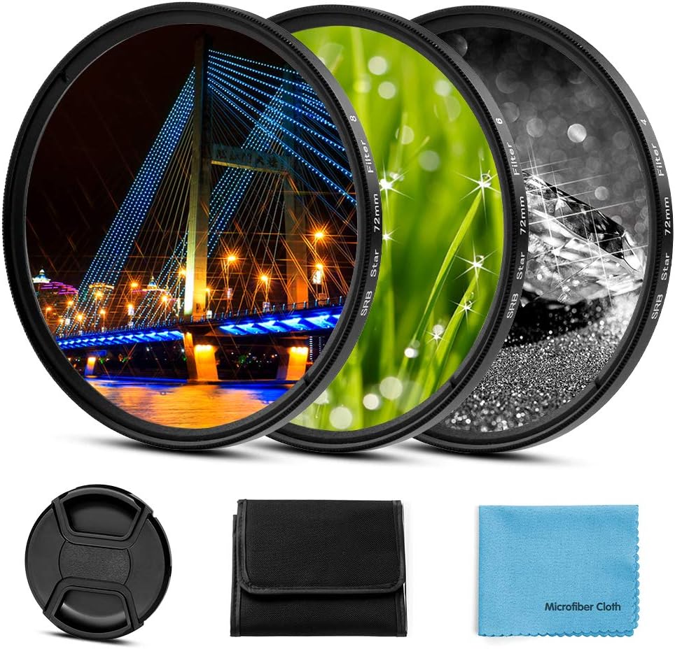[Paquete]: incluye un filtro en forma de estrella de 4 puntos de 55 mm, un filtro en forma de estrella de 6 puntos de 1,55 mm, un filtro en forma de estrella de 8 puntos y 1,55 mm, una funda de filtro de nailon de 1,1 x 3 ranuras, una tapa de lente de 55 mm y 1 paño de limpieza de lentes de microfibra.