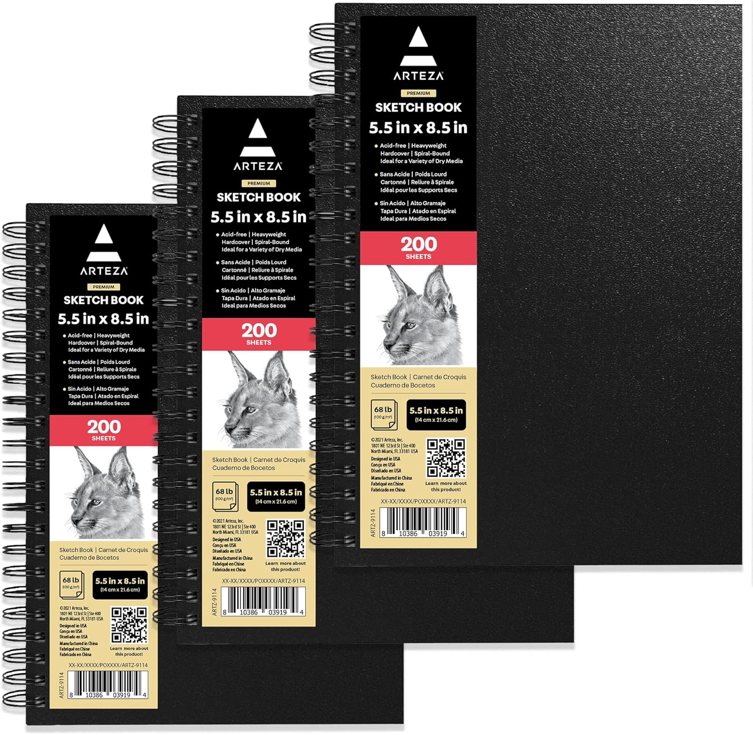 ARTEZA Spiral Sketch Book 5.5x8.5 Drawing Pad 3 Pack 100 Sheets Sketch Pads for Drawing for Adults & Teens