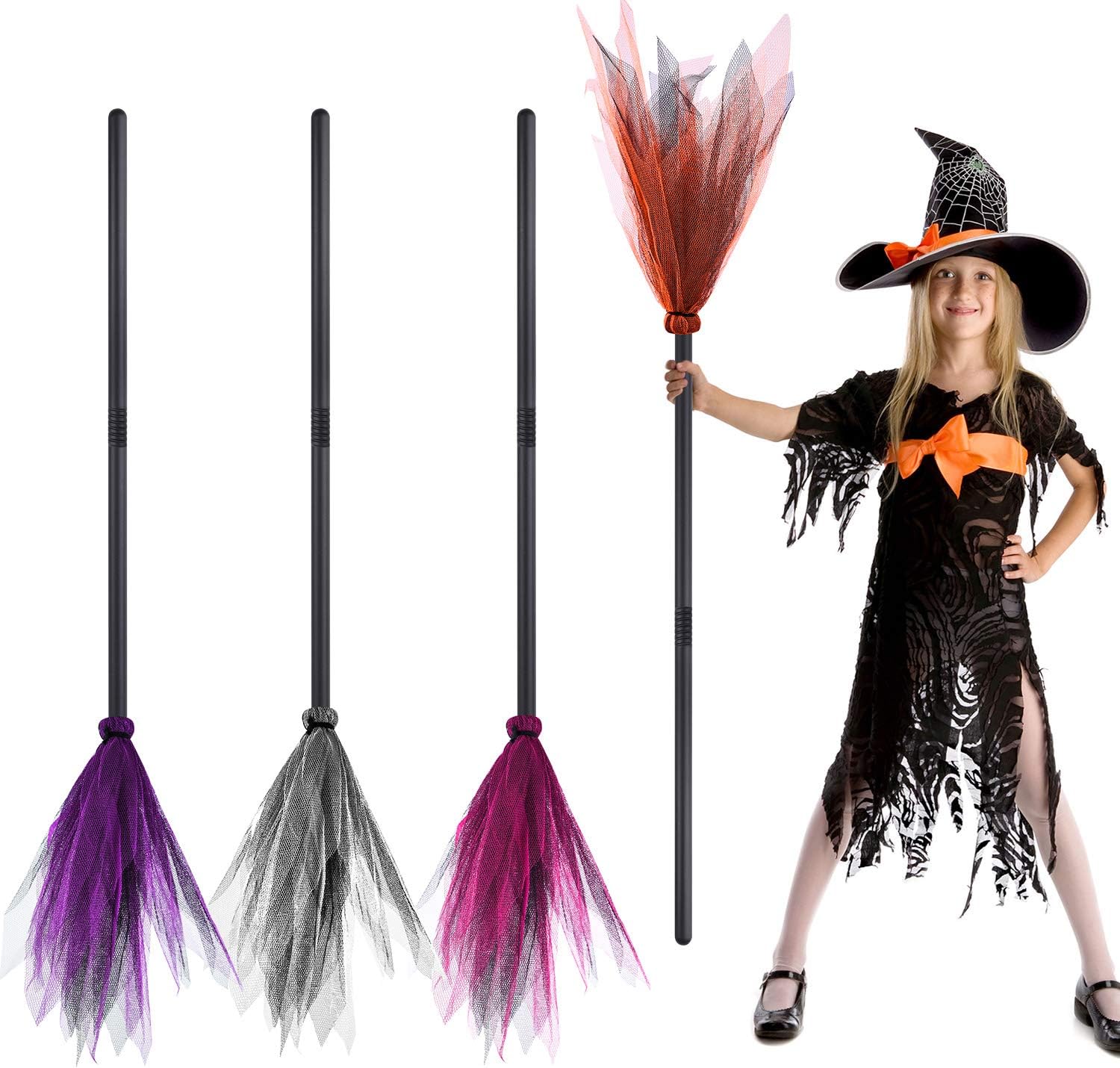Especificaciones: el paquete incluye: 4 escobas de bruja de Halloween. Color: morado, rojo, gris, naranja. Material: plástico e hilo. Tamaño: 89 cm/35 pulgadas de longitud total, hilo de pantalla: 31 cm/12 pulgadas. Nota: esta escoba solo se usa como accesorio de juego.