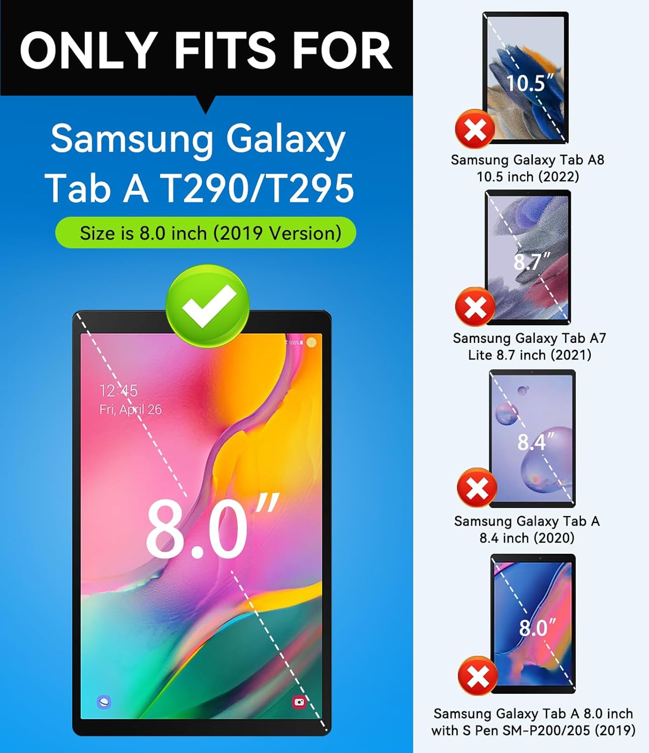 Modelos Compatibles: La funda Cantis es compatible con Samsung Galaxy Tab A T290/T295 (Solo tamaño de 8.0 pulgadas, lanzamiento de 2019). Tenga en cuenta: NO es compatible con Samsung Tab A 8.4 pulgadas (2020)/ Samsung Tab A8 (10.5 pulgadas) 2022/ Samsung Tab A7 lite 8.7 pulgadas (2021)/ Samsung Tab A 8.0 pulgadas con S Pen SM-P200/205 (2019).
