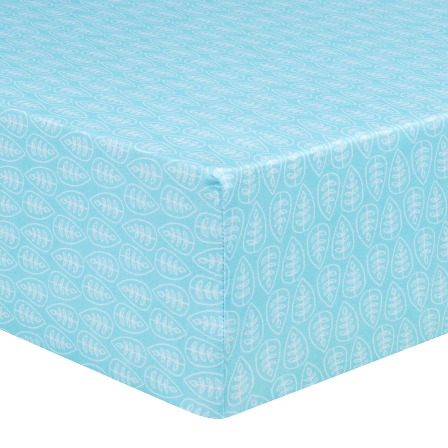 The leaves jersey fitted Crib Sheet by Trend Lab is 100% combed cotton jersey featuring a leafy print in pastel turquoise and white. Crib sheet fits a standard 28 in x 52 in crib mattress and features 9-inch deep pockets with elastic surrounding the entire opening ensuring a more secure fit. Additional colors, prints and Jersey products from Trend Lab are sold separately. Please adhere to JPMA's Safe Infant Bedding Practices.