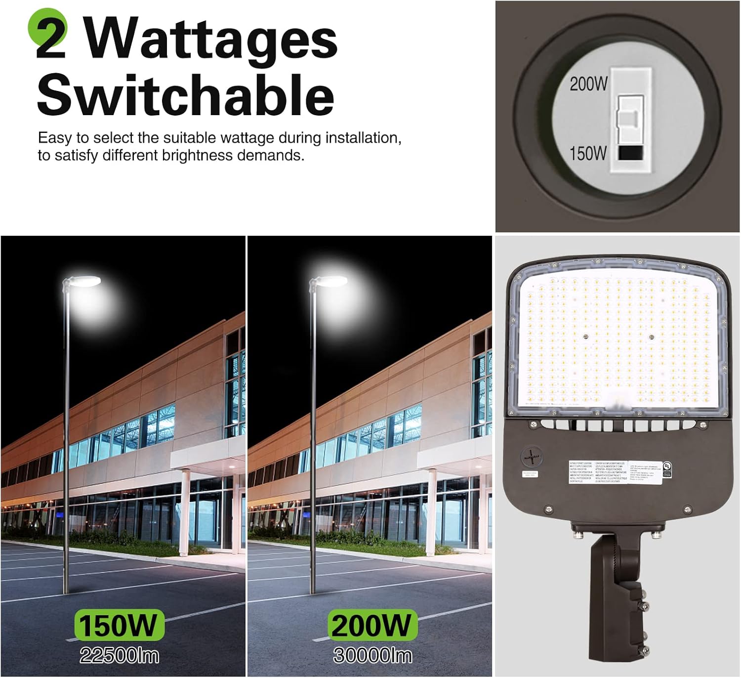 ✔ Energy Saving - This 150W/200W Switchable led parking lot light with photocell provides 22500-30000Lumens at 5000K daylight white. Use brand LEDs with Light efficiency 150lm/W, ideal to replace traditional 400w-600w metal halide, energy Savings of up to 70% over our product's lifespan.