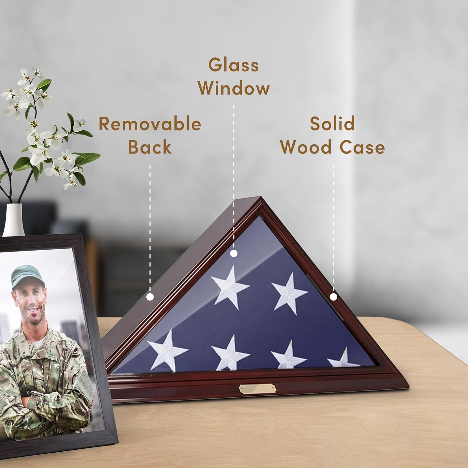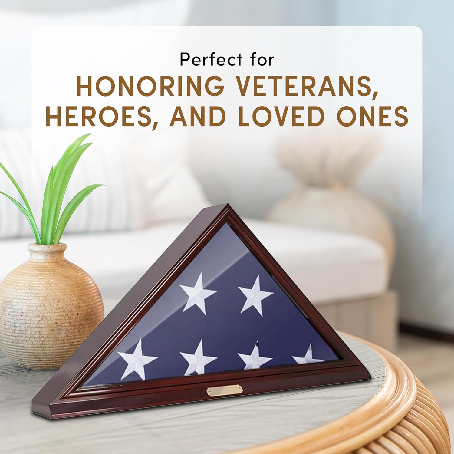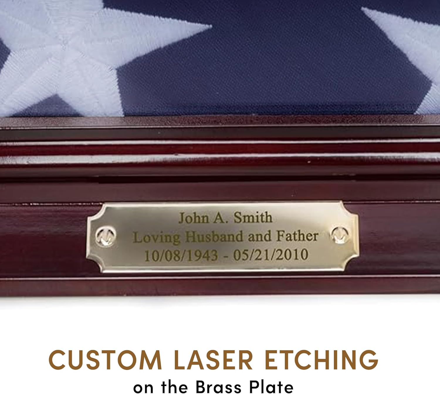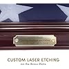 It features a brass metal plaque for engraving, a clear glass front to protect from dust, removable back for easy insertion, detailed beveled edge, matted interior to make it flag material friendly and two strong hanger for hanging on the wall.