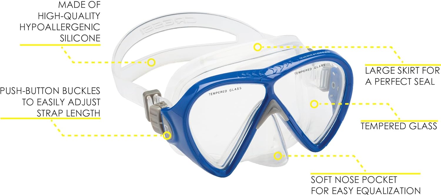 La máscara tiene 2 lentes de vidrio templado. La falda está hecha de silicona suave que se adapta a diferentes rostros y asegura un sello perfecto. Los cierres son fáciles de ajustar para la longitud de la correa.