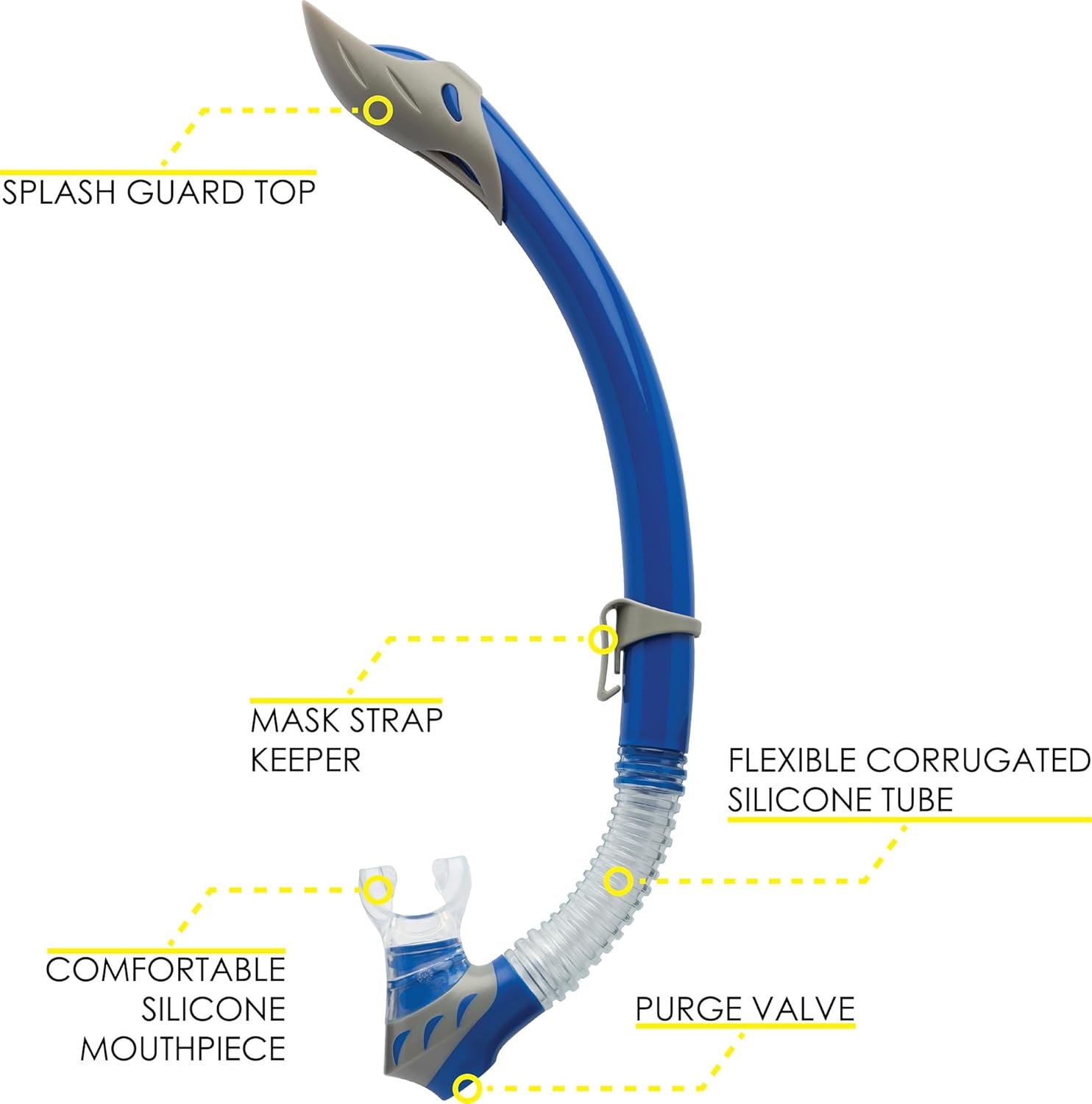 El snorkel cuenta con un protector antisalpicaduras que reduce la entrada de agua. Una válvula de purga inferior permite expulsar fácilmente el agua. La boquilla está hecha de silicona suave hipoalergénica.