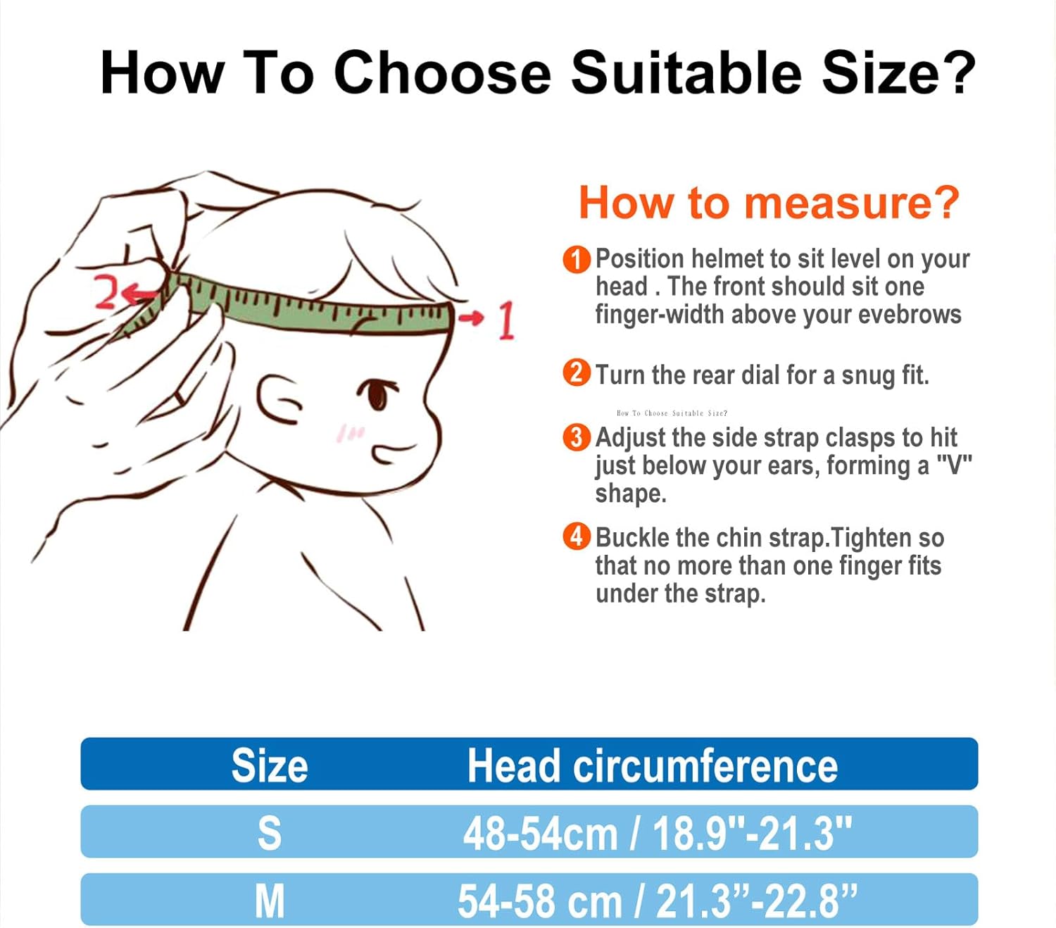 Fitted Kids Helmet:While every other kid bicycle helmet appears loose and does not fit your child's head perfectly, our kids helmet for 2 - 8 years old comes with an adjustable harness/wheel ratchet that can be adjusted to fit heads measuring 18.9 - 21.3 inches
