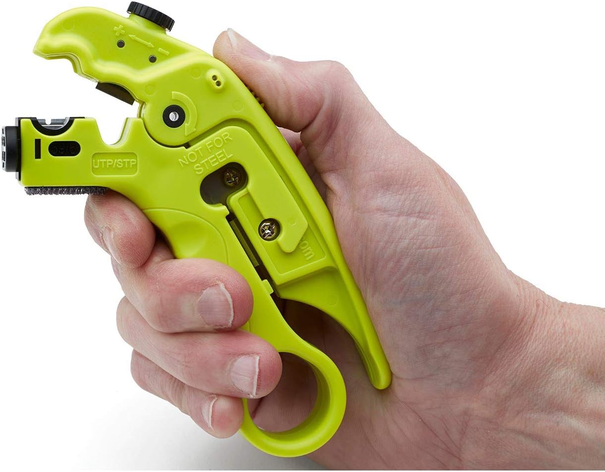 VERSÁTIL. Pelar fundas de Ethernet desde Cat3 hasta Cat6A. Pelar y preparar cables coaxiales desde RG59/6 hasta RG7/11. Profundidad de pelado infinitamente ajustable para un corte perfecto en la funda del cable.