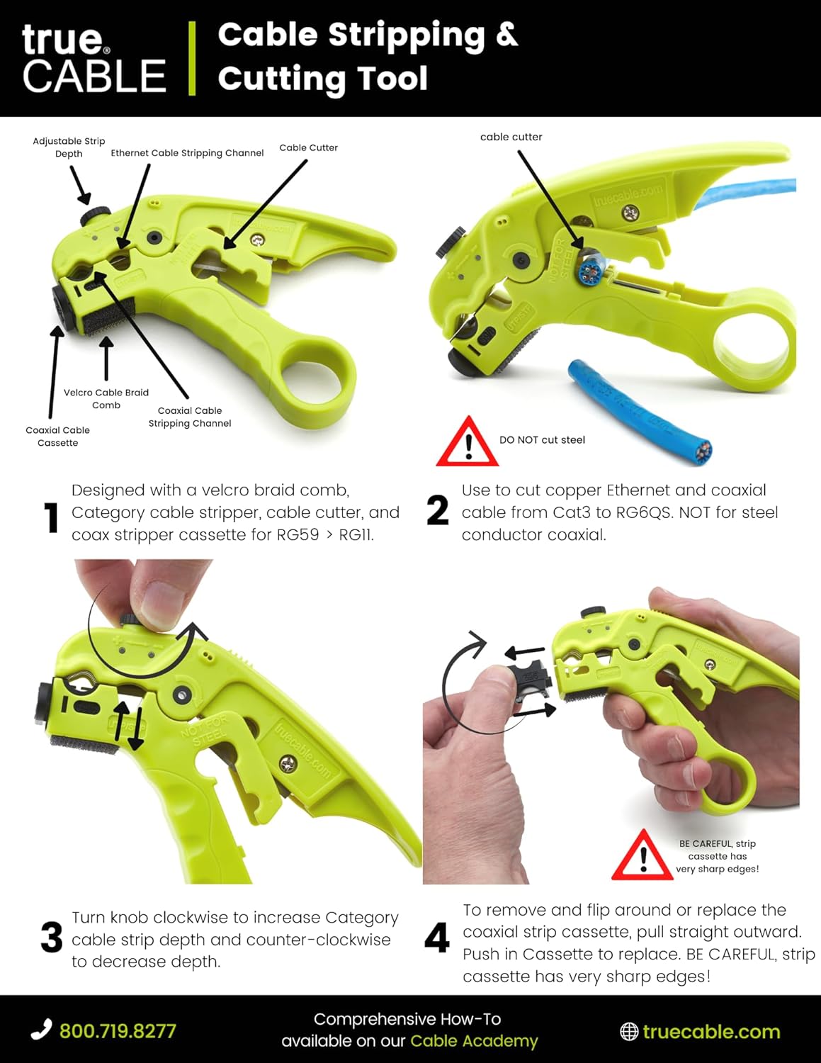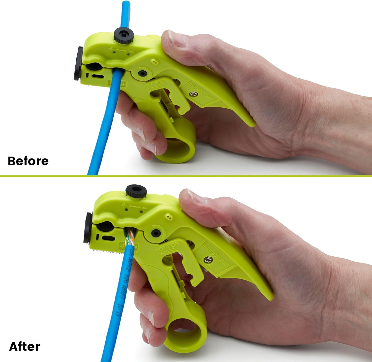 herramienta de pelar y cortar cables trueCABLE para UTP, FTP, STP, Cat5e, Cat6, Cat6A Ethernet, RG59, RG6, RG7, RG11 coaxial, hoja de profundidad ajustable
