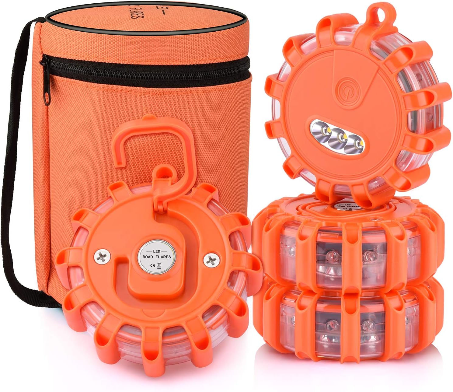 AK [4 Paquete de Luces LED de Emergencia para Carretera con Base Magnética y Gancho, Kit de Baliza de Advertencia para Vehículos y Barcos con Bolsa de Almacenamiento Premium (Baterías No Incluidas) (4)