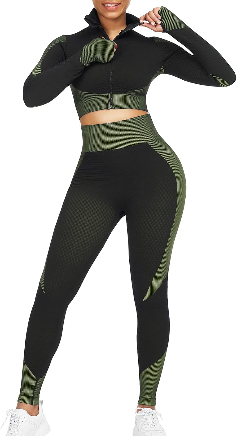 JOYMODE Women's Workout Sets 2 Piece long sleeve High Waist Legging set Crop Top Gym