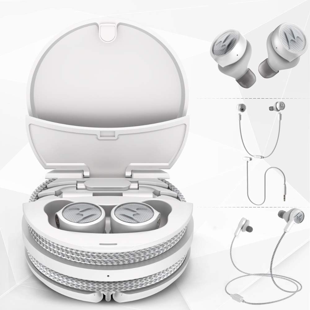 Auriculares Inalámbricos Inteligentes Motorola Tech 3-en-1 True Wireless - Auriculares sin Cable, Estilo Deportivo, Conector de Audio - IPX5, Micrófono Integrado, Estuche de Carga Magnético con Sistema de Almacenamiento de Cables - Blanco Platino