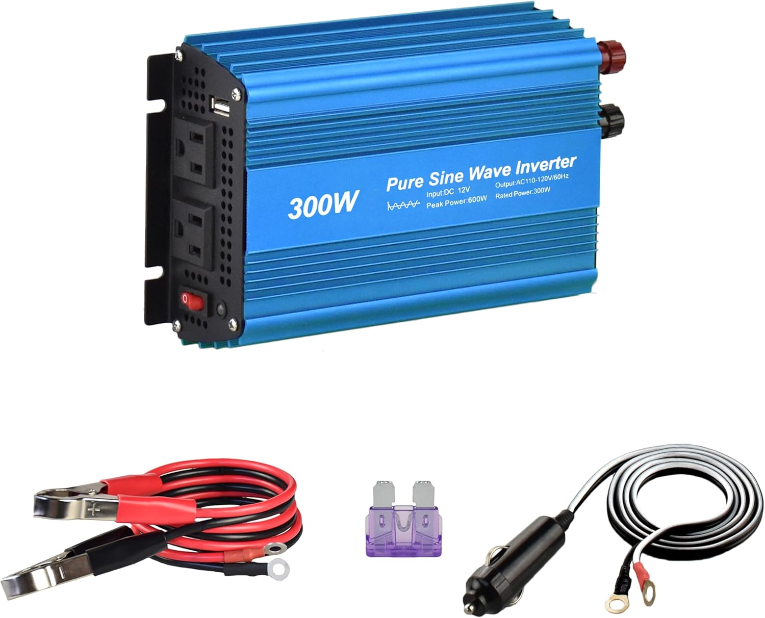 Inversor de energía de onda sinusoidal pura de 12 V CC a 120 V CA de 300 W con salida de enchufe doble y salida USB de 5 V CC de 2 amperios Ideal para la mayoría de los aparatos eléctricos pequeños. (300 W)