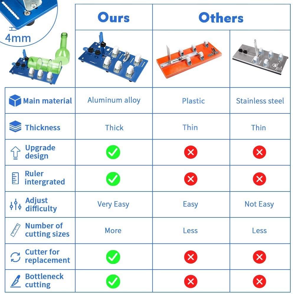 AJUSTABLE Y DURADERO: Nuestro cortador de botellas puede manejar cualquier tamaño de botellas redondas simplemente ajustando la ubicación de la cuchilla y la placa deslizante. La base y la placa deslizante en forma de L están hechas de una aleación de aluminio de alta calidad, lo cual es más duradero y estable que los cortadores de acero inoxidable y plástico delgados del mercado.