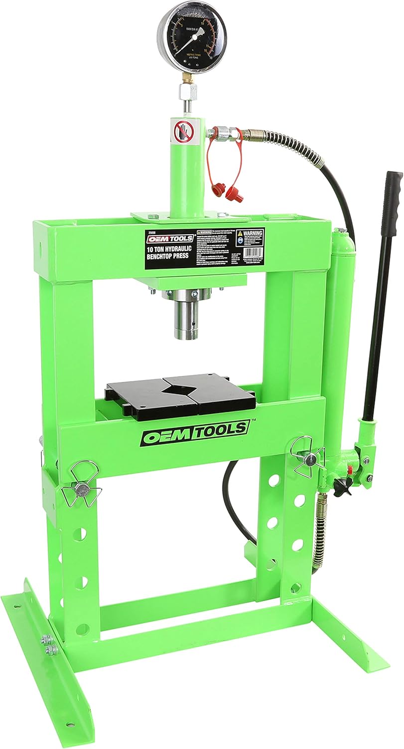 The OEMTOOLS 10 Ton Hydraulic Benchtop Shop Press provides big performance in a small package! Its compact size gives you great flexibility in where you can set up your press. You can easily straighten, bend, press off parts and bearings, etc. -- and the double speed pump reduces set-up and press time. The liquid filled pressure gauge allows you to quickly view an accurate pressure reading. This unit has a durable, powder coated finish and complies with ASME PASE 2014 Standards. Note: The seller may contact the customer by Amazon message or phone to confirm shipping details. Freight carrier will make a delivery appointment with the customer, and customer signature will be required at delivery. Freight carrier will unload the pallet from the truck, and then it will be the customer s responsibility to move it to its final destination and assemble it.