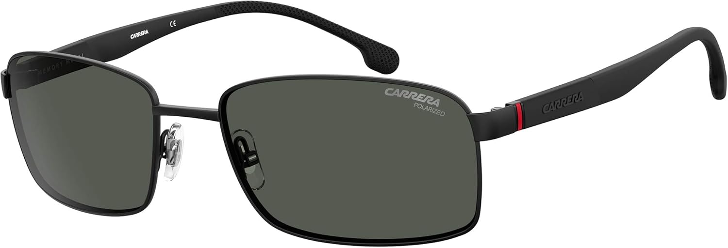 Las Gafas de Sol Rectangulares Carrera 8037/S para hombre cuentan con una montura negra mate con lentes polarizadas grises. Las dimensiones de las lentes son 58mm x 18mm, y la longitud de las asas es de 140mm. Estas gafas de sol ofrecen protección UV y vienen con una garantía internacional de 2 años. Hechas de acero aleado con cobertura de montura completa y textura de armazón de acetato, son adecuadas para uso general y conducción. El producto incluye el estuche de Carrera.