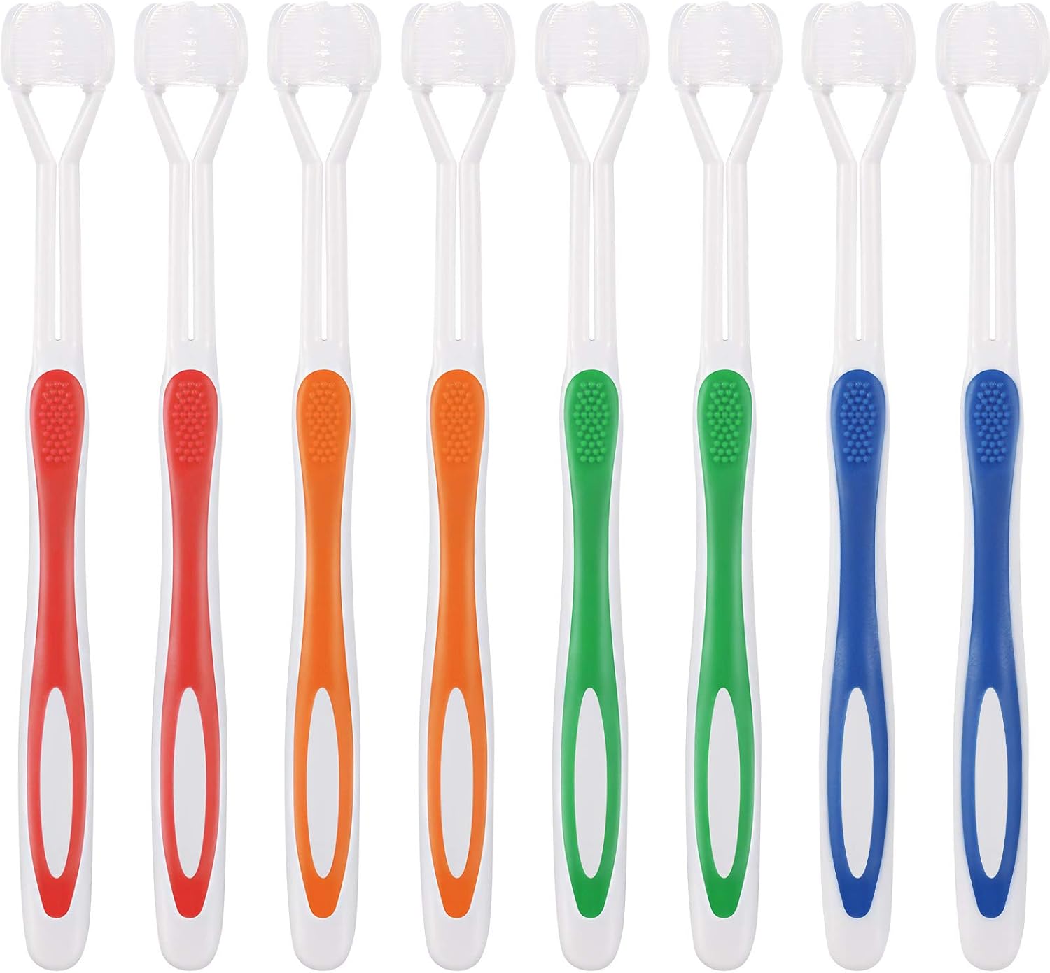 Cepillo de dientes para autismo de 8 piezas, cepillo de dientes de viaje de tres cerdas para el cuidado completo de los dientes y las encías, las cerdas de gran ángulo limpian cada diente, suave/suave (verde, azul, amarillo, rojo)