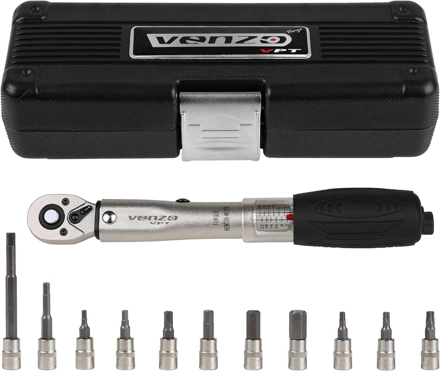 Juego de llaves dinamométricas Venzo Drive Click de 1/4 de pulgada, kit de mantenimiento de bicicletas de 2-22 Nm para bicicletas de carretera y montaña, multiherramienta para motocicletas, incluye enchufes Allen y Torx, barra de extensión de 4 mm y 5 mm y almacenamiento