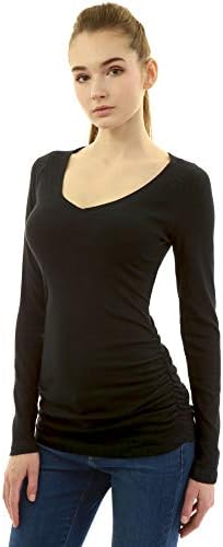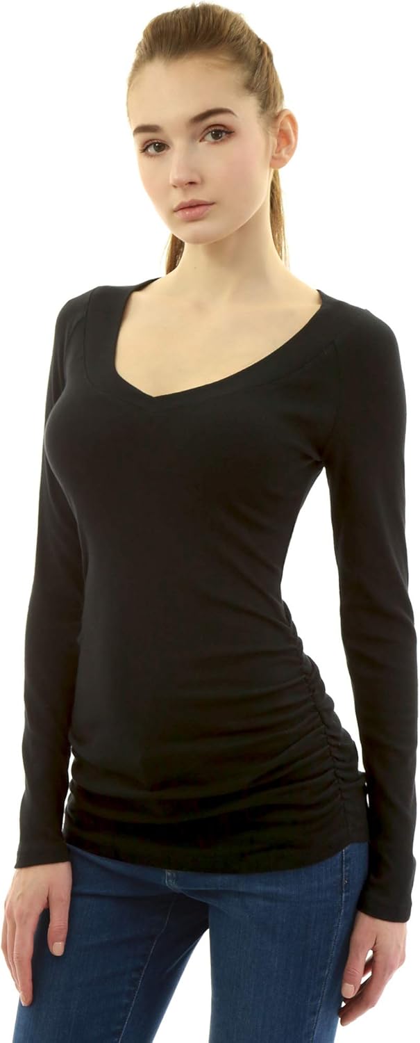 AmélieBoutik Women V Neck Raglan Long Sleeve Ruched Sides Top