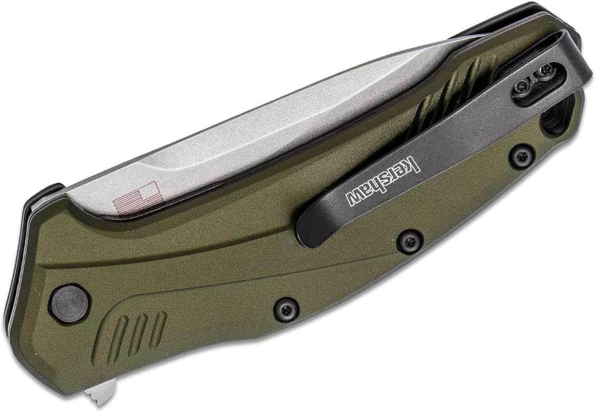 6061-T6 ALUMINUM HANDLE: The olive green anodized aluminum handle provides lightweight strength, along with machined patterning for an enhanced grip. Includes reversible pocketclip for right/left, tip-up carry.