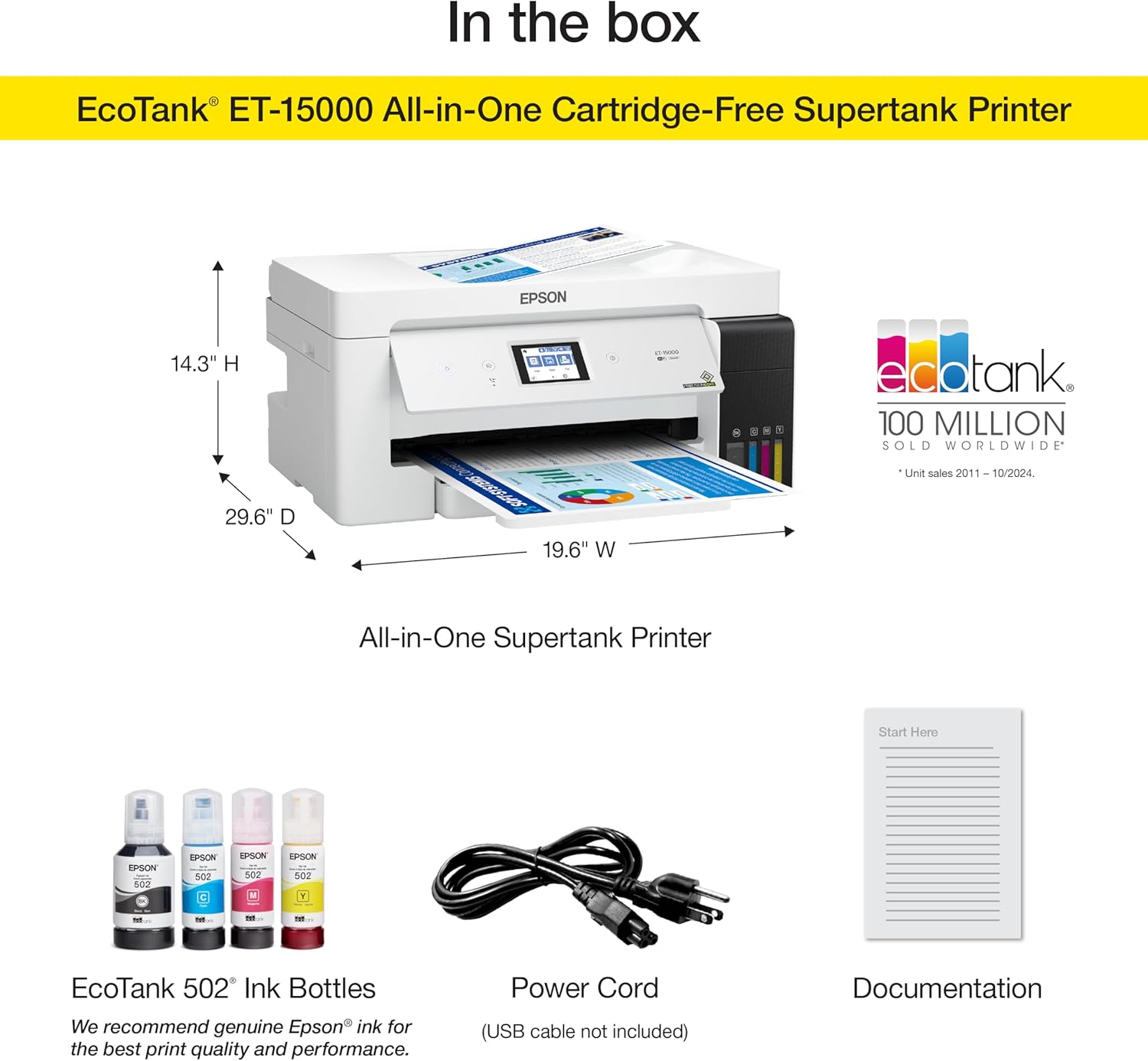 Impresora Todo en Uno Supertanque Epson EcoTank ET-15000 Inalámbrica a Color, con Escáner, Copiadora, Fax, Ethernet e Impresión hasta 13 x 19 Pulgadas, Blanca