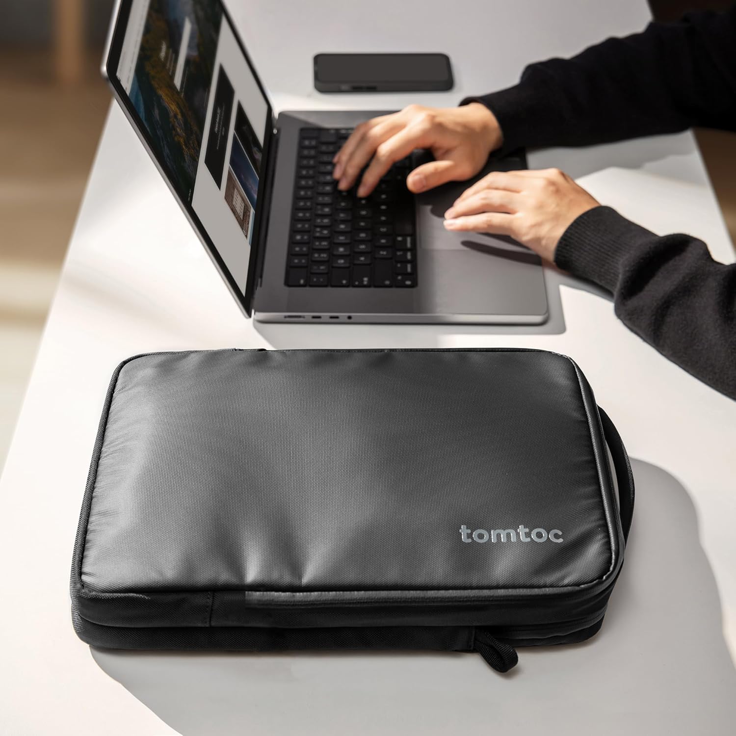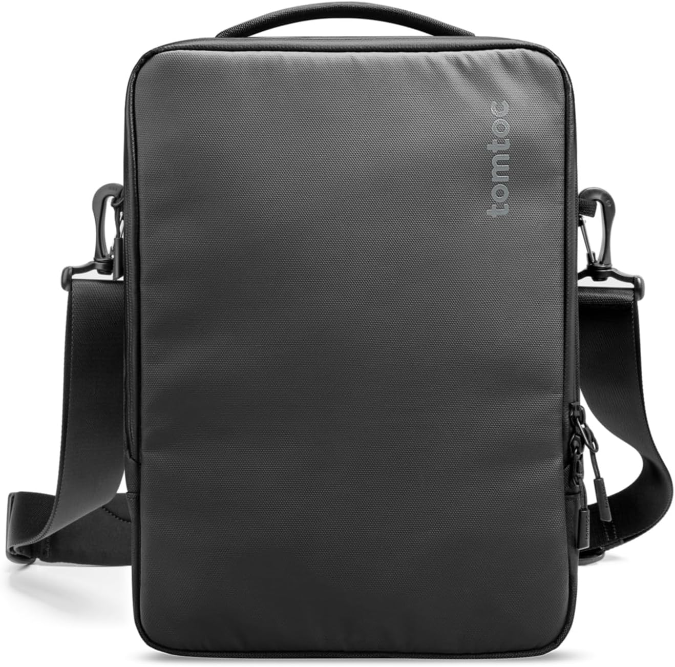 Durabilidad de alta resistencia: Nylon balístico CORDURA de estándar militar con cremalleras YKK y hebillas impermeables proporcionan una increíble robustez y durabilidad. Los materiales robustos resistirán el desgarre y la abrasión, lo que ofrece una utilización larga y duradera. Protección CornerArmor en 4 esquinas. Proveedores líderes de la marca. Cremallera YKK y superficie repelente al agua. Múltiples formas de transporte cómodo. Bolsillo grande organizado Para combatir las situaciones más difíciles, desde caídas hasta golpes y vibraciones, tomtoc propuso el concepto de protección 360 y diseñó la bolsa para portátil con tecnología CornerArmor, bordes de alta resistencia y acolchado de doble densidad. Pasó la prueba de caída de estándar militar mientras mantiene un diseño elegante. La bolsa para portátil tomtoc para hombro cuenta con un compartimento principal para tu portátil y un bolsillo delantero patentado único con muchos bolsillos para accesorios como iPad, bolígrafo, cargador, banco de energía, ratón y otros artículos esenciales. Cuenta con un cinturón de hombro desmontable y ajustable con almohadillado estable para una comodidad ergonómica superior; el asa superior y una asa lateral te permiten llevar tu portátil y accesorios de manera conveniente durante mucho tiempo. Dimensiones del compartimento para portátil: 12.80" x 9.14" x 0.9" Compatible con la mayoría de portátiles de 13 a 14 pulgadas y accesorios 14-inch Nuevo MacBook Pro M3 Chip, M3/Pro, M3/Max 2023 13-inch MacBook Air M2/A2681, M1/A2337, A2179, A1932, A1466, A1369 (2022-2009) 13-inch MacBook Pro M2/A2686, M1/A2338, A2251, A2289, A2159, A1989, A1706, A1708, A1502, A1425 (2022-2012) 12.9-inch iPad Pro Surface Book 3/2/1, 13.5-14.4 Pulgadas Nuevo Surface Laptop Studio 5/4/3/2/1 Surface Pro 9/8/X/7+/7/6/5/4/3/2/1 con Teclado de firma/Cubierta de tipo Dell HP Acer Asus Lenovo HUAWEI 13-14 pulgadas portátiles Dimensiones externas: 13.40" x 9.92" x 2.76"; Bolsillo delantero: 12.80" x 9.14" x 1.6"; Peso:0.93 LB Material: Nylon balístico CORDURA Cremallera: YKK impermeable 1 x Bolsa para hombro para portátil de 13-14 pulgadas