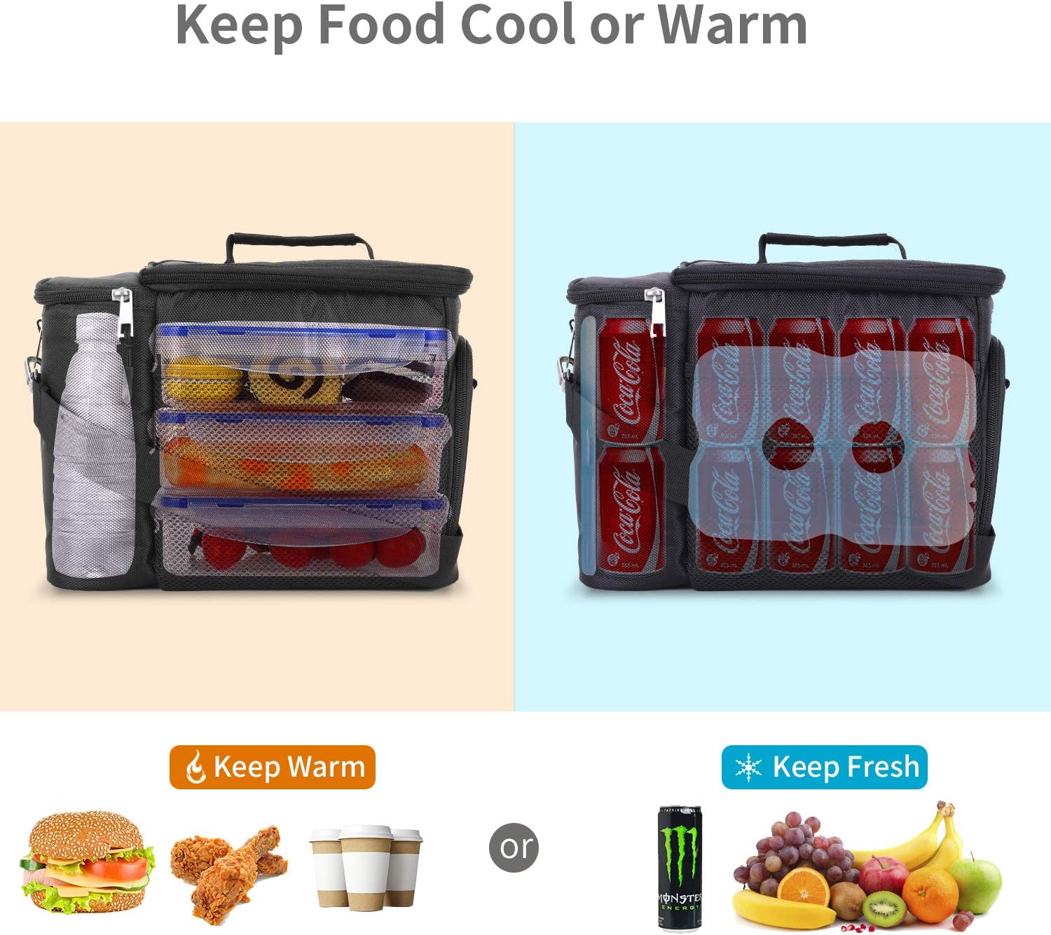 Fiambrera reutilizable de gran capacidad: esta lonchera más fría mide 13 pulgadas de largo x 7 pulgadas de ancho x 9 pulgadas de alto, se adapta a 3 recipientes grandes de preparación de comidas que regalamos o almacena un máximo de 18 latas de cola o cervezas, hay múltiples compartimentos para almacenar alimentos que deben mantenerse calientes y fríos al mismo tiempo, bolsillos de malla en ambos lados pueden almacenar