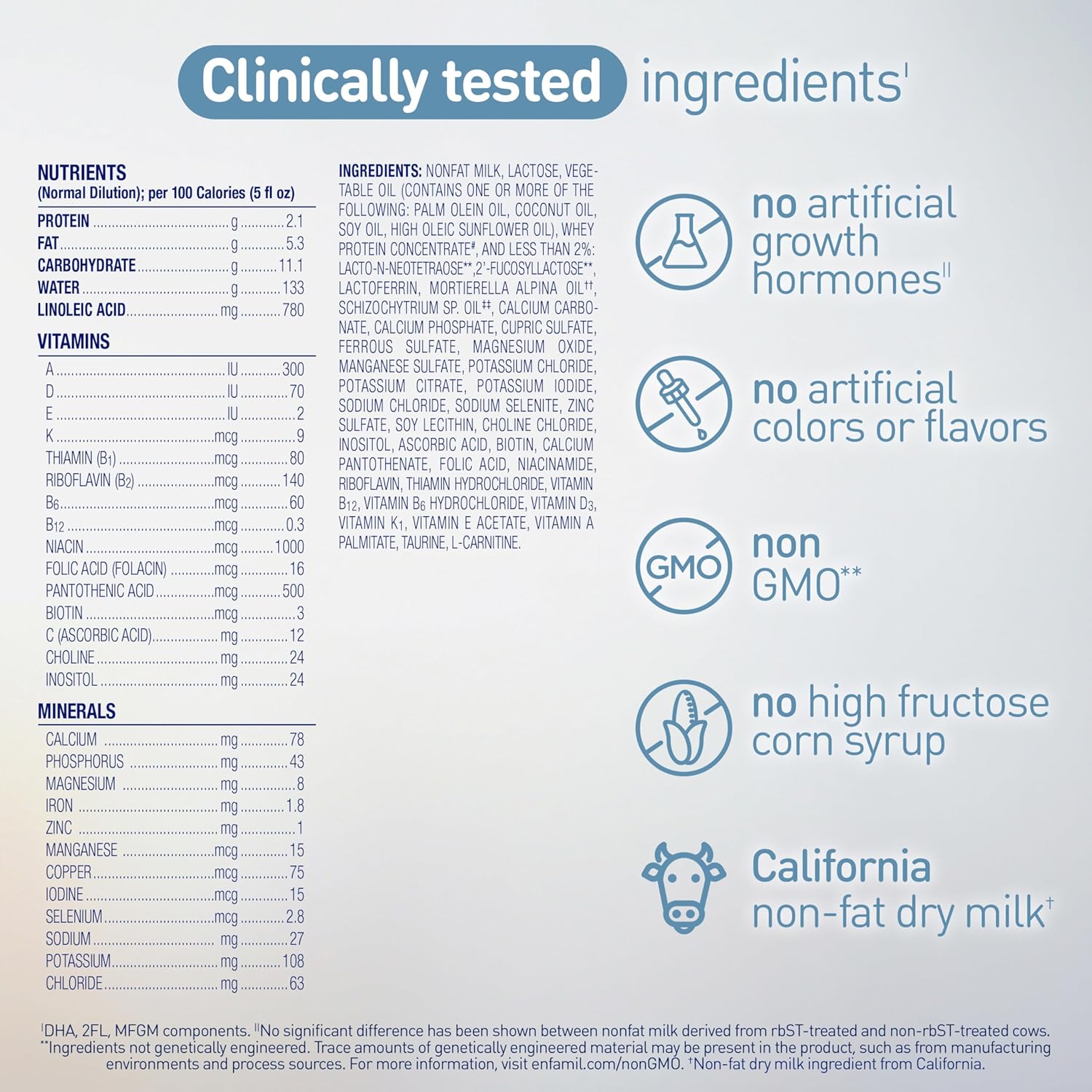 NO ARTIFICIAL ADDITIVES & NON-GMO: Has clinically-tested, non-GMO ingredients. Free from artificial growth hormones, colors, and flavors. Enfamil Optimum does not contain high fructose corn syrup and is made with milk sourced from the United States. Optimum is premium baby formula for infants through 12 months of age.