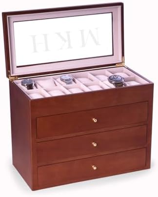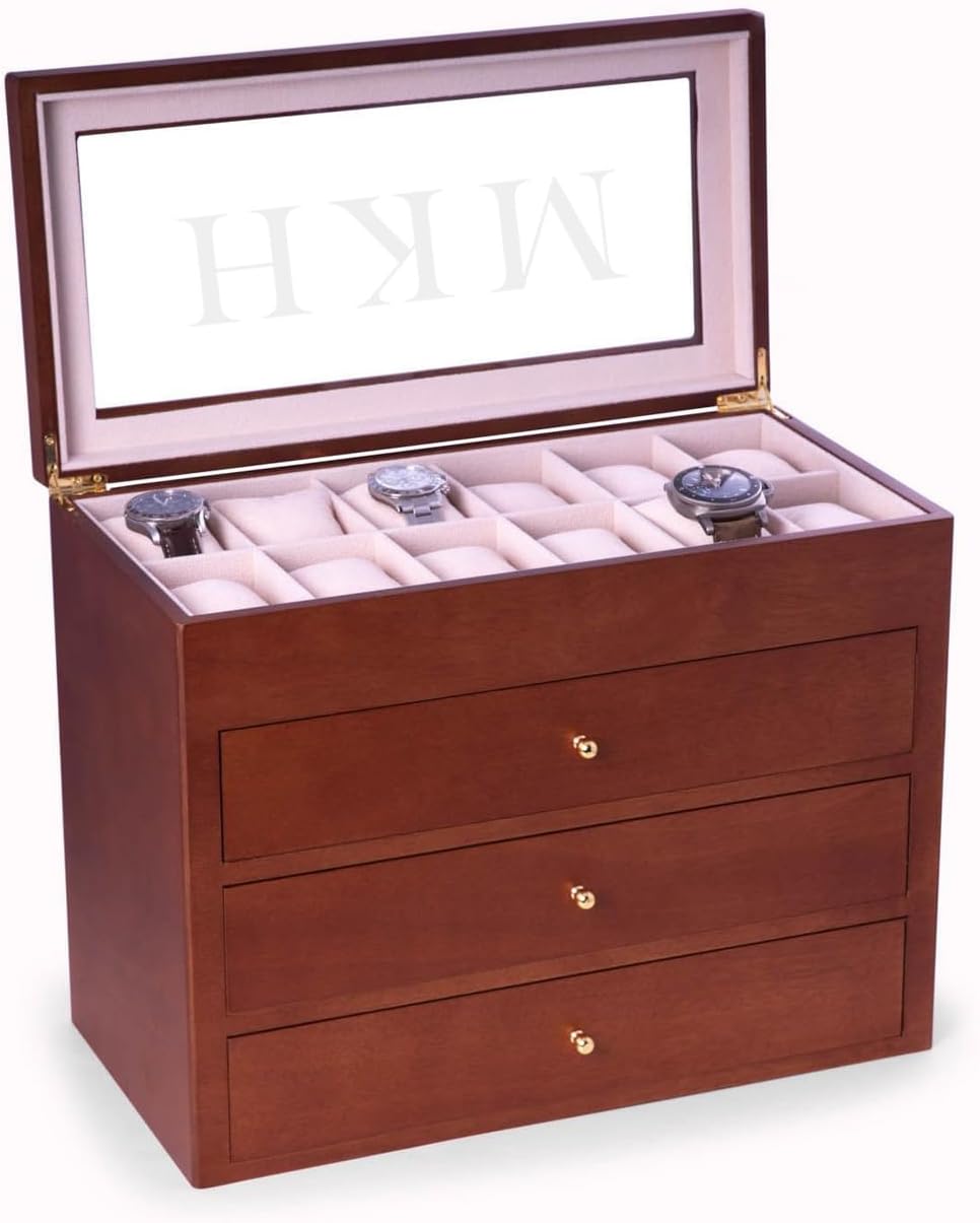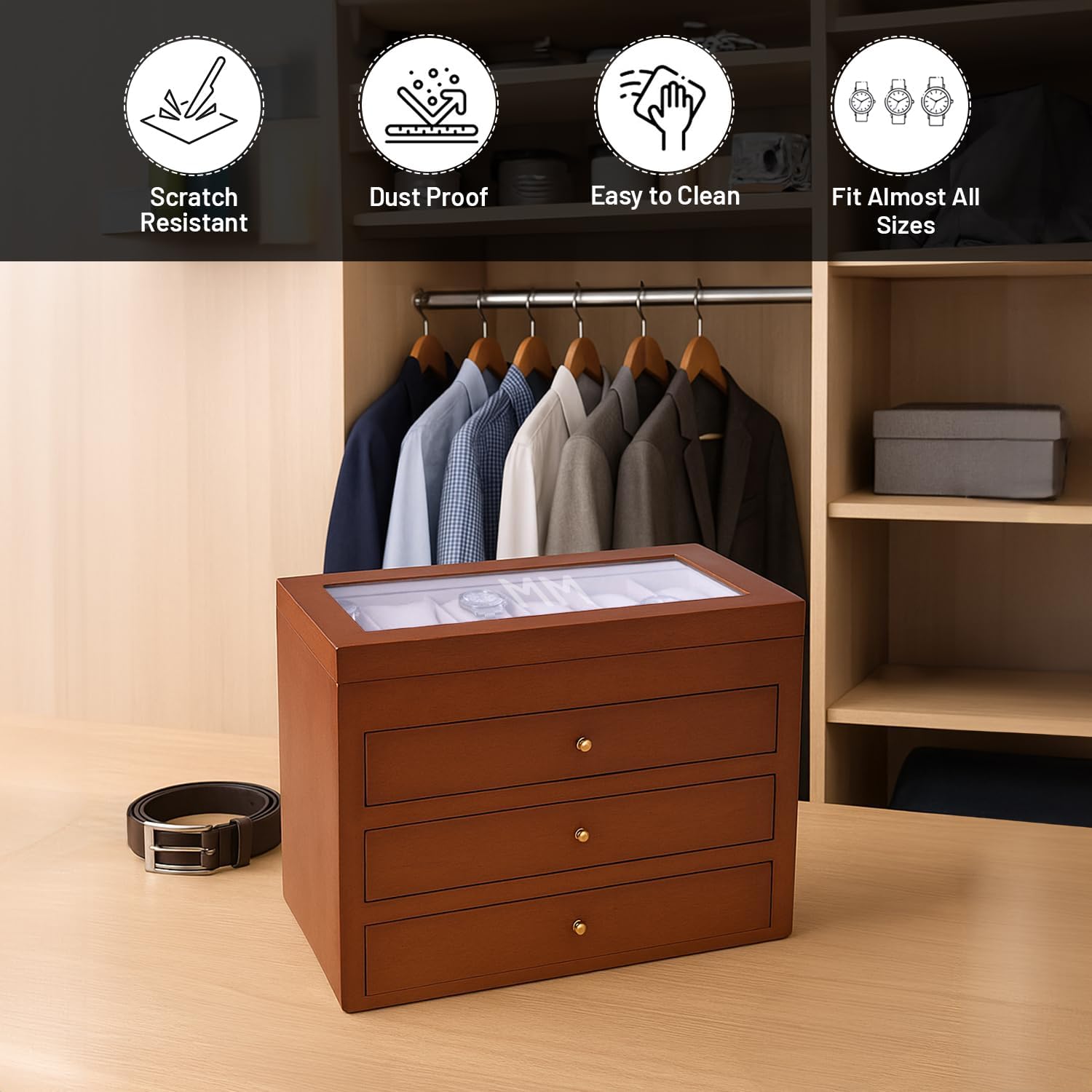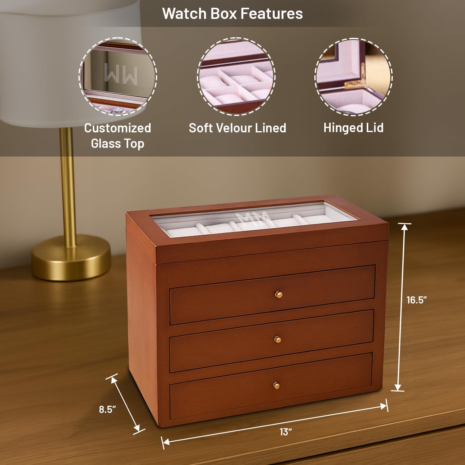 Premium Material: Crafted from solid cherry wood with a sleek glass display top for a stylish and secure watch organizer.