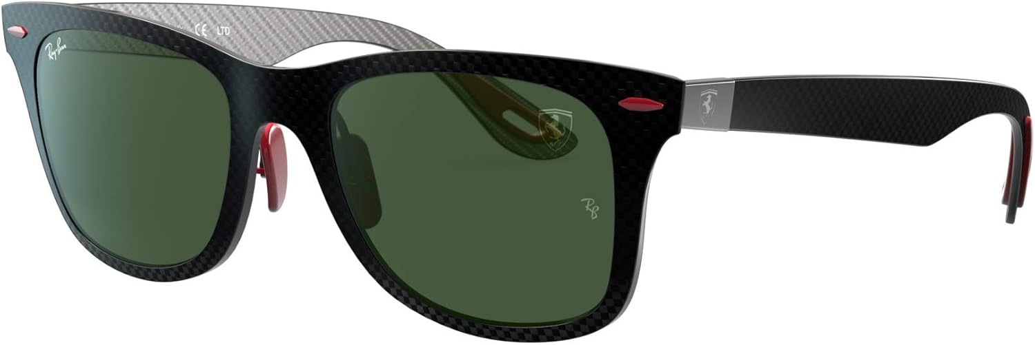 A legendary frame just got more legendary. Made from the same material used in aeronautics and high-performance race cars, the Carbon Fiber. It features the Prancing Horse on the temple and lens as well as details in Ferrari red. You can't go wrong. 100% UV PROTECTION: To protect your eyes from harmful UV rays, these unisex sunglasses include lenses that are coated with 100% UV protection. MULTIPLE FRAME AND LENS COLORS: Choose from multiple frame colors, lens colors and lens treatments. Find a color combination that fits your personal brand and style. CASE & CLEANING CLOTH INCLUDED: Each pair of Ray-Ban sunglasses come with a cleaning cloth and case to clean and protect your sunglasses from scratches and damage. LIMITED WARRANTY INCLUDED: Ray-Ban sunglasses sold by authorized sellers, like Amazon.com, are eligible for all manufacturer warranties and guarantees. VISIT THE RAY-BAN BRAND SHOP: Click on the Ray-Ban link above the product title to shop the entire Ray-Ban sunglass and eyeglass assortment.