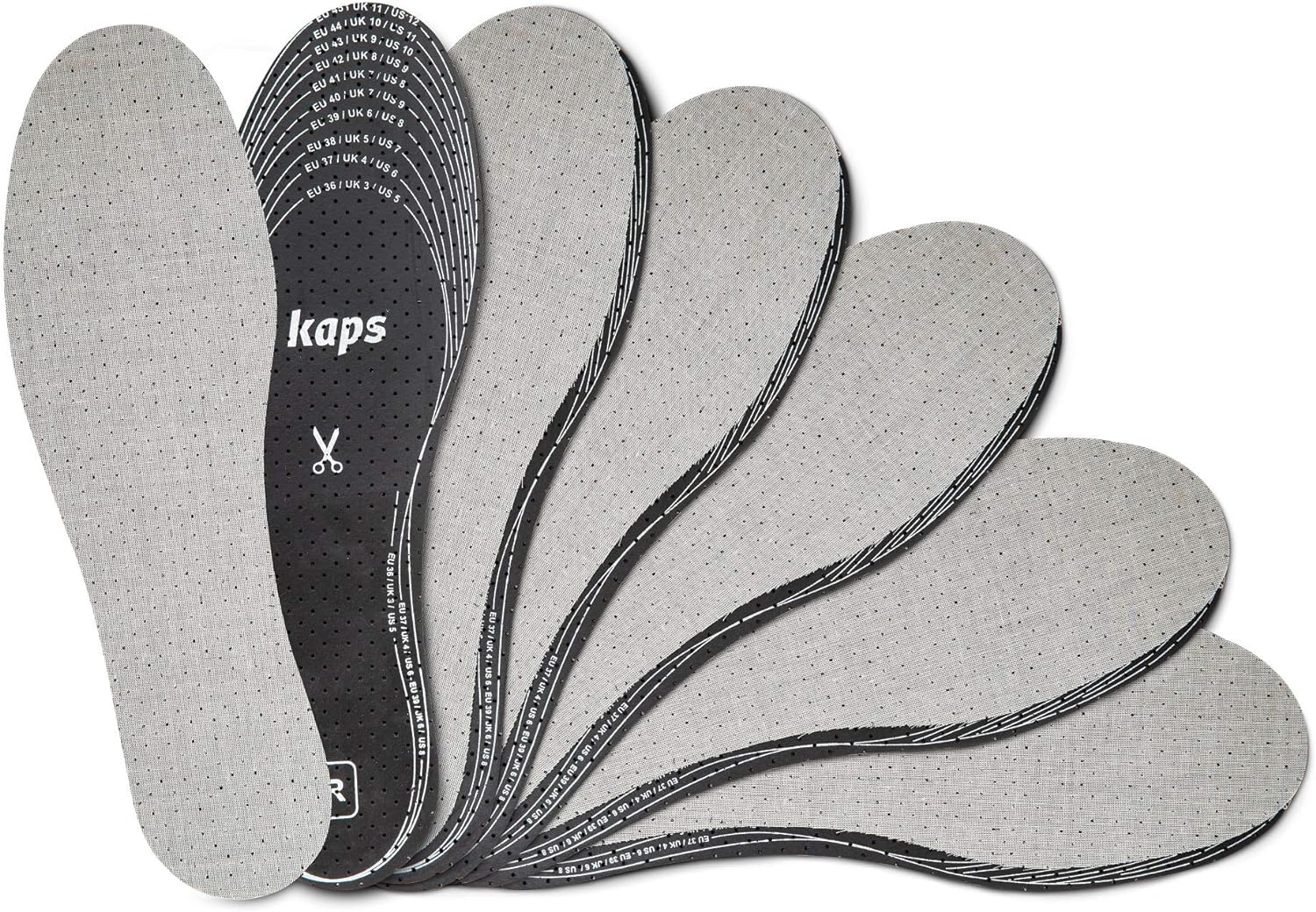 CIRCULACIÓN DEL AIRE: las plantillas Kaps Odour Stop están perforadas para mejorar la transpirabilidad. Absorben la transpiración para mantener los pies frescos, secos y cómodos durante todo el día. Acolchados en la parte superior con un agradable tejido.