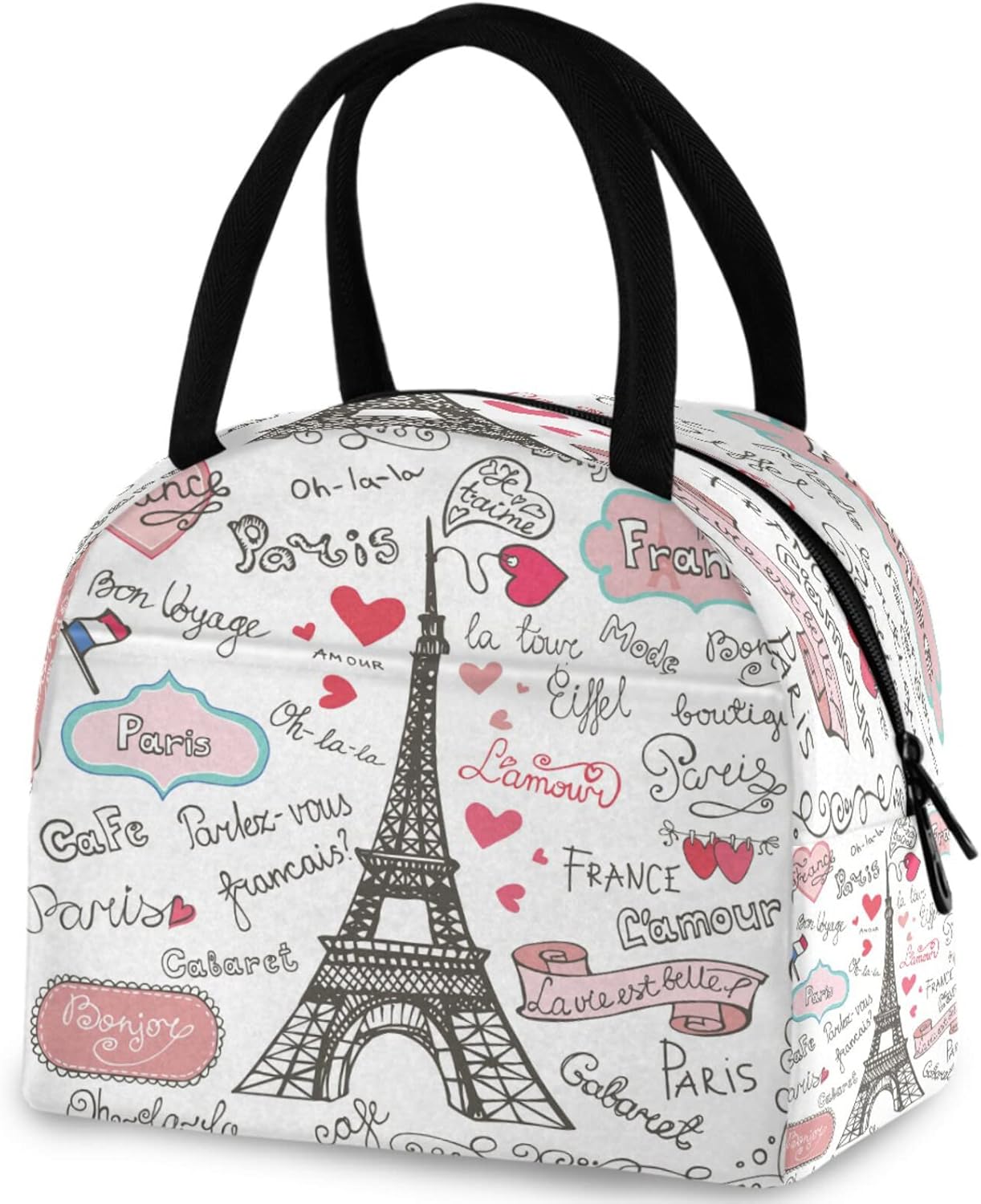 Cute Collection Paris Eiffel Tower Symbols Reusable Lunch Tote Bag with Front Pocket Zipper Closure Insulated Thermal Cooler Container Bag for Man Women Work Picnic Travel Beach Fishing