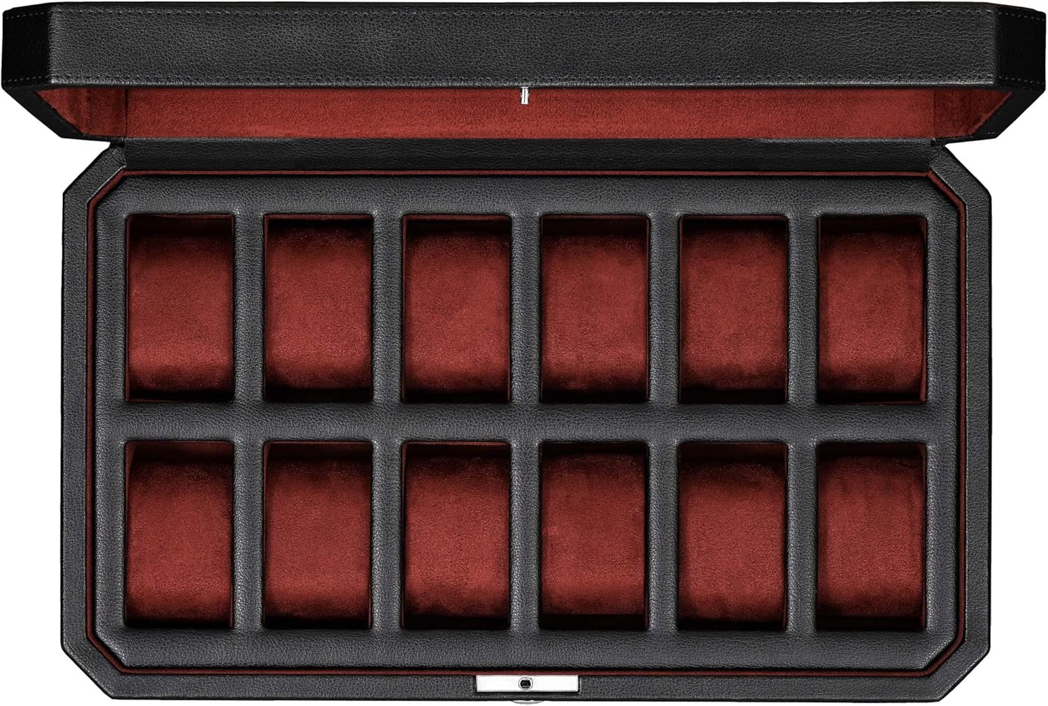ROTHWELL 12 Slot Leather Watch Box for Men - Luxury Case Display Jewelry Organizer with Microsuede Liner - Travel Jewelry Case for Mens Accessories, Travel Organizer (Black & Red)