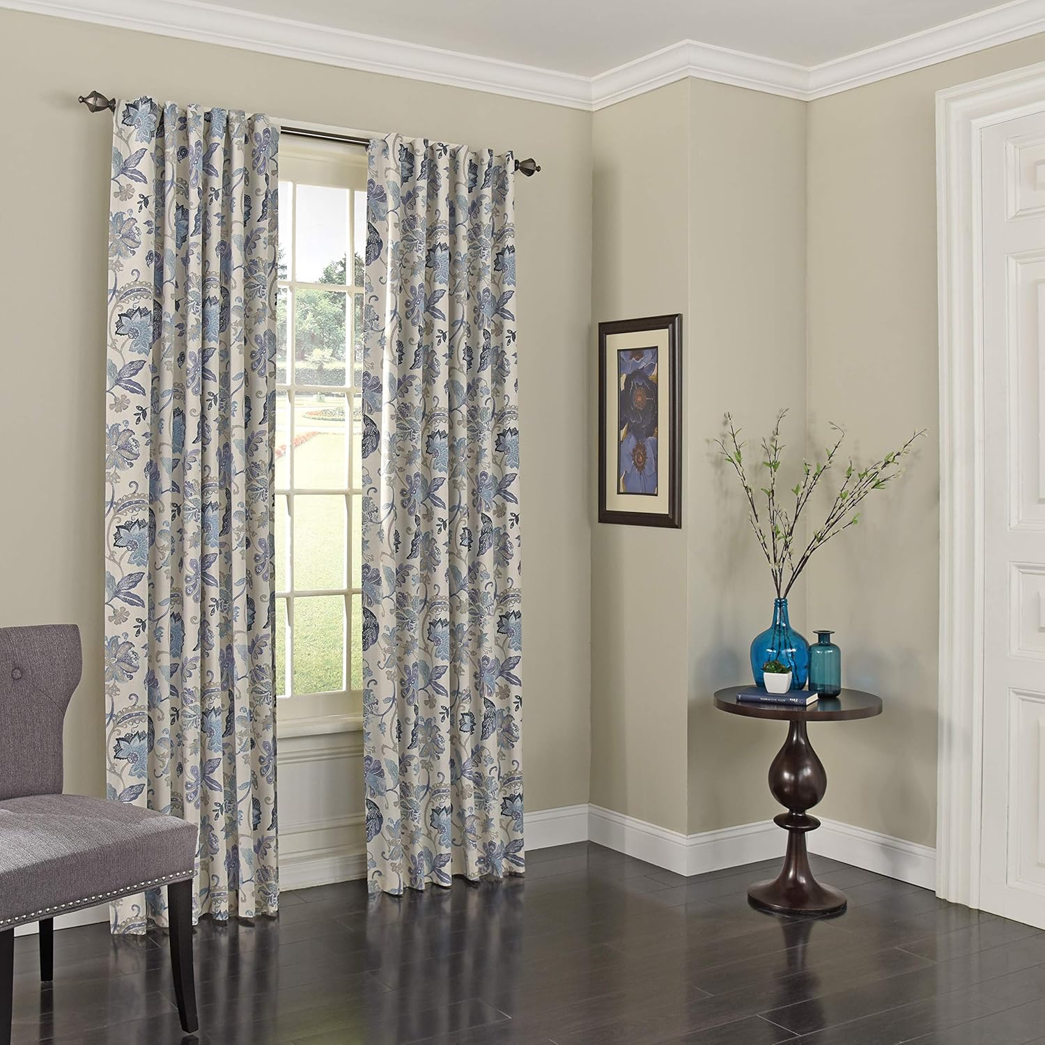 Find the perfect combination of fashion and function with the Eclipse Nina Blackout Curtains. Eclipse offers a complete line of functional curtains that provide privacy, manage light, reduce noise, and help with energy savings, without sacrificing the latest looks in window fashion. These beautiful panels offer blackout benefits and feature an updated traditional Jacobean floral with a rich linen texture. Premium thermal lining gives this panel a rich hand and provides luxurious drapability. Each panel measures 52 inches wide in your choice of 63, 84, 95, or 108 inches long. Panel offers back tab and rod pocket hanging options. Pockets measure 3 inches and are recommended with a 1.5 inch rod for maximum movement. Curtain rod sold separately. Polyester, cotton, rayon, and linen blend. Lined panel. Machine wash cold with similar colors, delicate cycle. Use non-chlorine bleach only if needed.