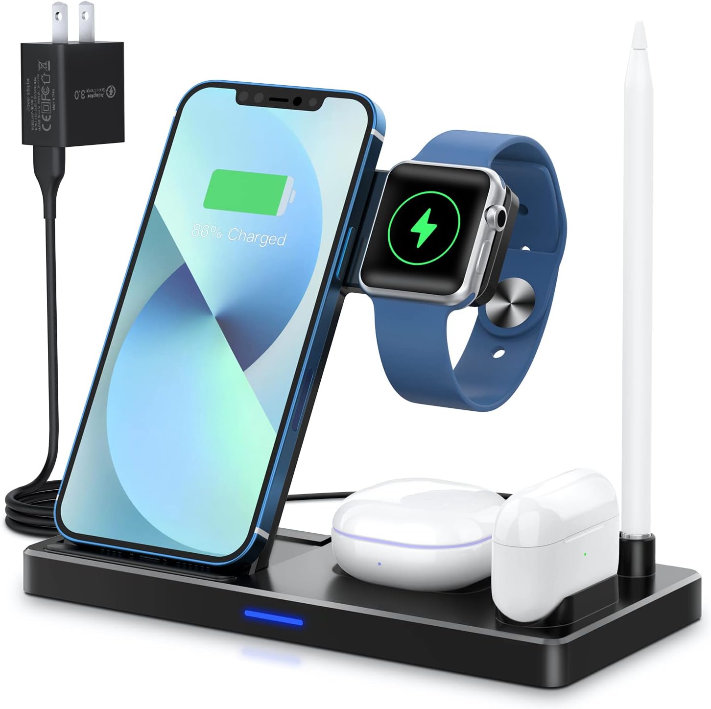 Cargador inalámbrico WAITIEE 5 en 1, estación de carga inalámbrica para iWatch SE/7/6/5/4/3/2, AirPods Pro/3/2/1, Pencil, estación de carga rápida para iPhone 13/13Pro/13Pro Max/12/12Pro/11/11 Pro Max/XR/XS Max/Xs(Negro)