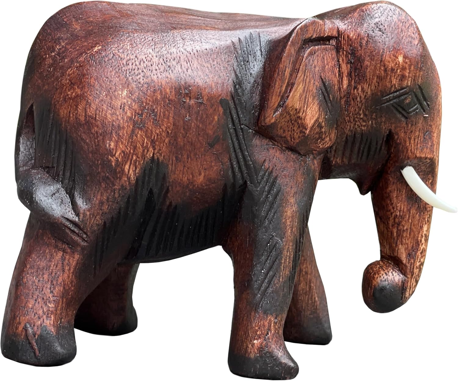 Hand Carved Wooden Elephant Statue - Wood Elephant Carving from Thailand - Feng Shui Elephant Figure - Brown, 5.5 Inches