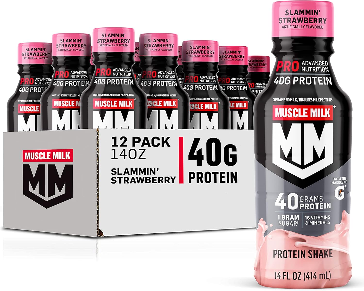 Muscle Milk Pro Advanced Nutrition Protein Shake, Slammin' Strawberry, 14 Fl Oz Bottle, 12 Pack, 40g Protein, 1g Sugar, 16 Vitamins & Minerals, 6g Fiber, Workout Recovery, Energizing Snack, Packaging May Vary