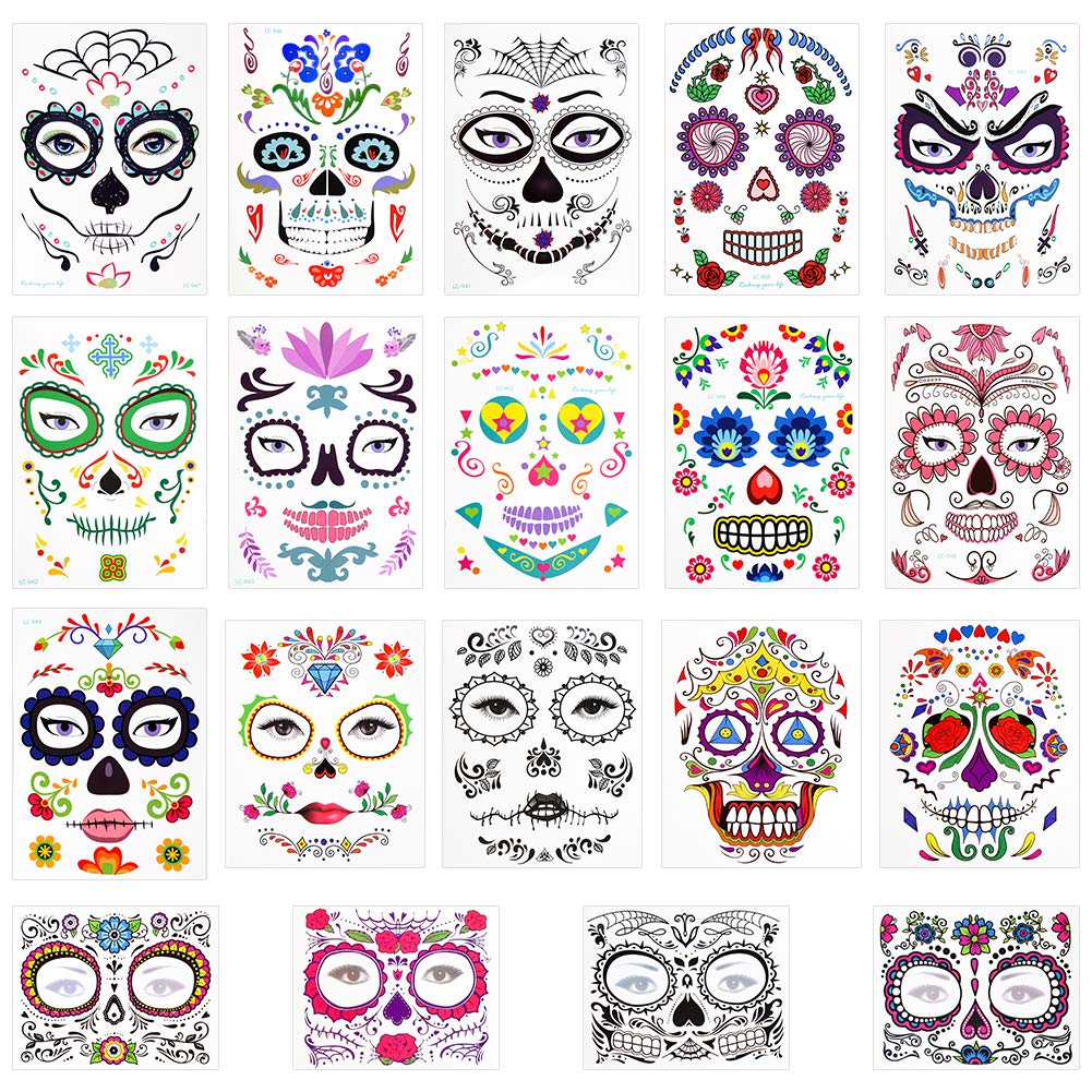 VALUABLE SET - You will receive Day of the Dead face tattoos in 19 different styles, in vibrant and bright colors, unique and eye-catching, suitable for Halloween and Day of the Dead parties.