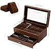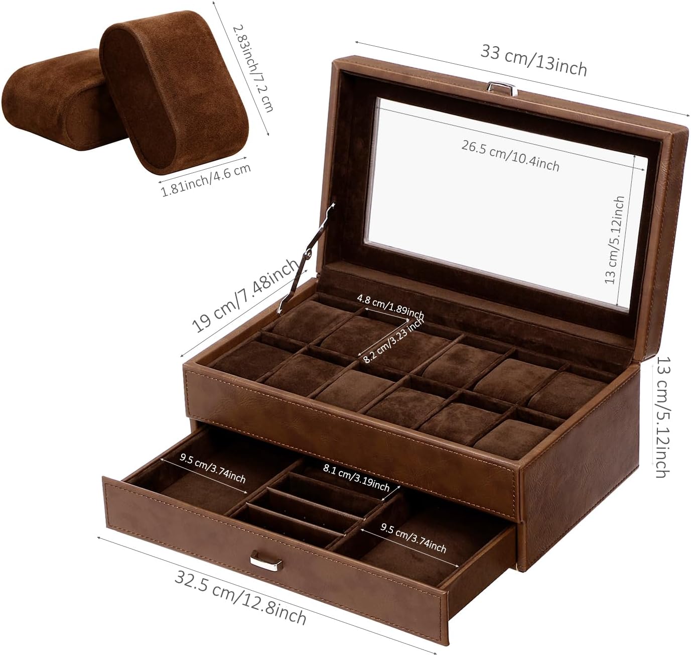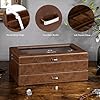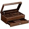 Caja de reloj BEWISHOME para hombre, organizador de relojes de lujo de piel sintética con cajón para joyas, parte superior de vidrio real, bisagra de metal, marrón SSH12Z