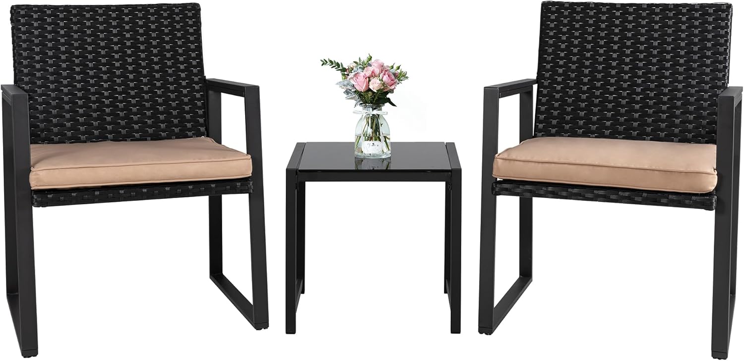 Walsunny Modern Khaki Patio Bistro Set: 2 Chairs & Table with Cushions, Black Wicker & Glass Top
