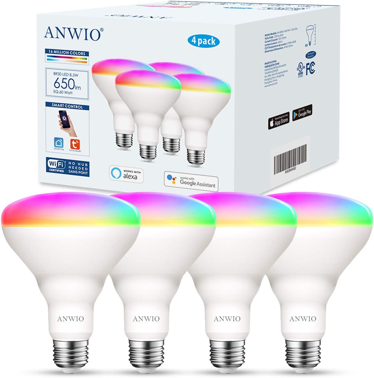 ANWIO Smart Light Bulb BR30 RGB Color Changing LED WiFi Dimmable Multicolor Light Bulbs E26 Base, Compatible with Alexa, Google Assistant, No Hub Required, 650 Lumen 8.5W (60W Equivalent) 4 Pack