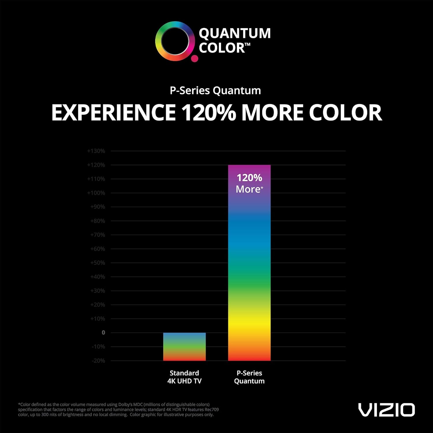 Quantum Color - Built on VIZIO's high-performance Active Full Array Backlight, VIZIO’s next-generation quantum color delivers cinematic color intensity with 120% more color than standard 4K TVs. Color volume measured using Dolby's mdc spec that factors the range of colors and luminance levels; standard 4K HDR TV features rec 709 color, up to 300 nits