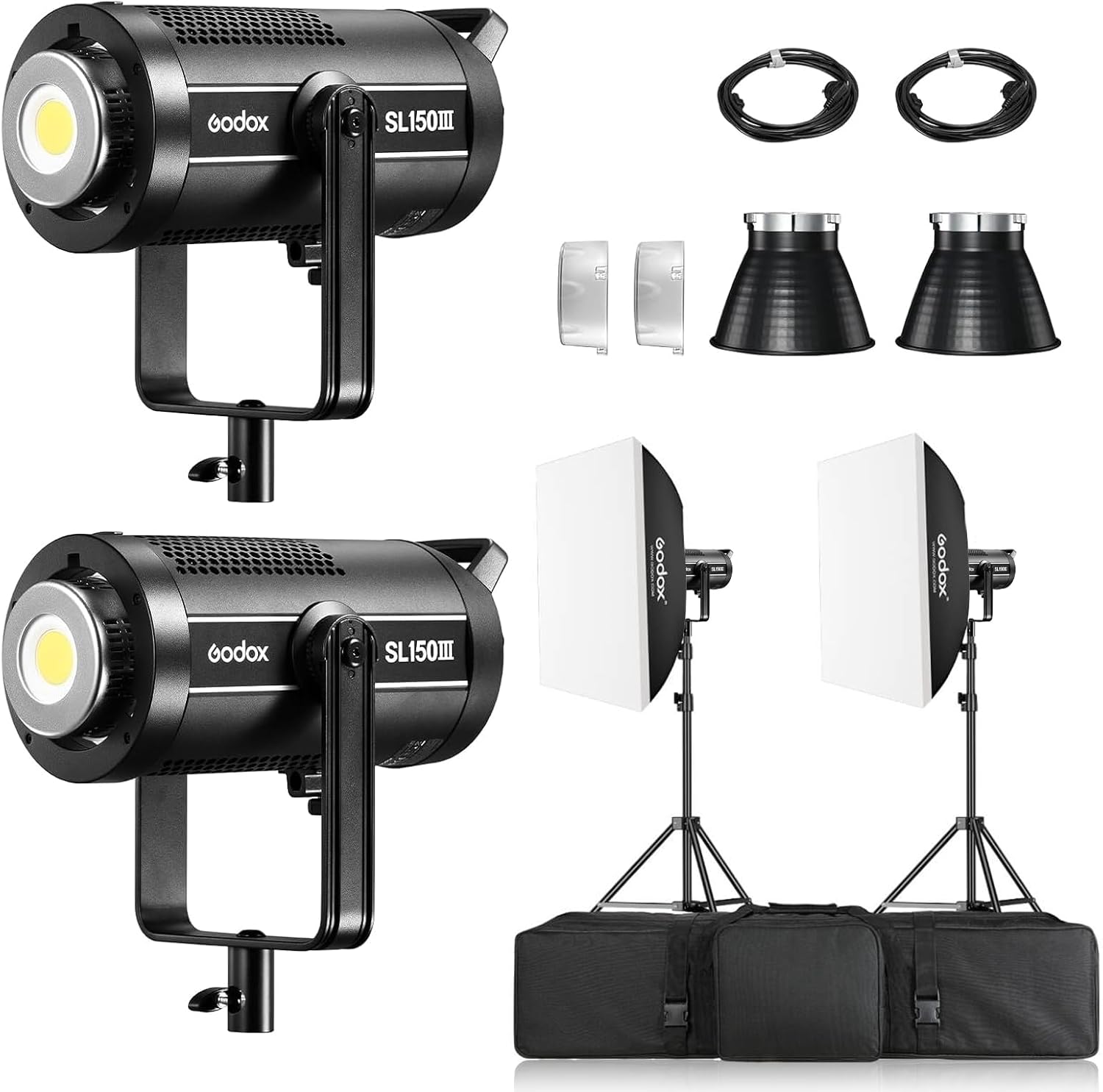 Godox 2 Pack SL150III LED Video Light Kit Godox 300W Continuous Studio Light 8 FX Effects App Control 2.4G Wireless System Bowens Mount with Standard Reflectors, Softboxes, Light Stands, Bag