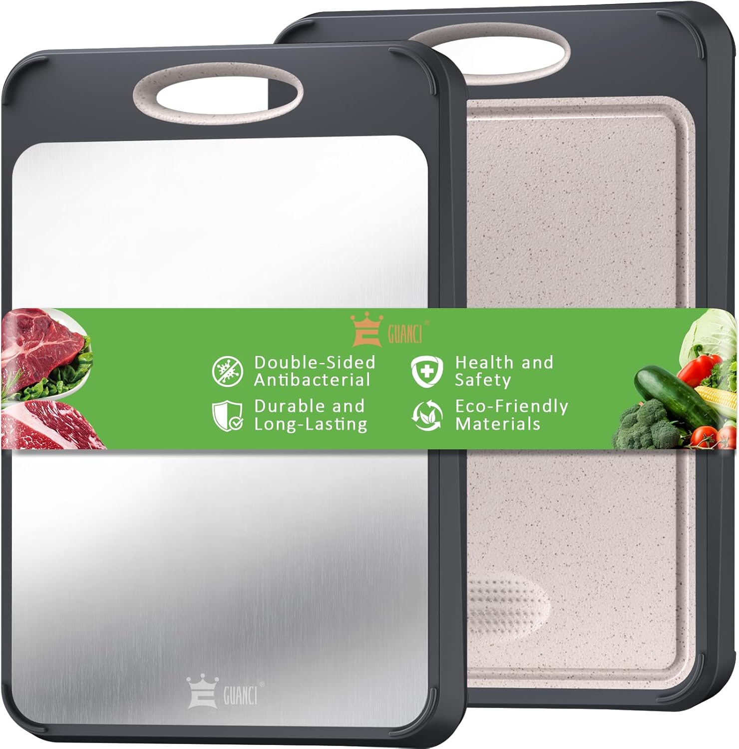 2 IN 1 Cutting Board : GUANCI cutting board is a versatile 2 in 1 kitchen tool, with one side made of food-grade 304 stainless steel for cutting raw and cooked meat, and the other side made of wheat straw PP material for cutting vegetables and fruit