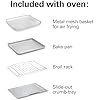 INCLUYE UNA CESTA METÁLICA PARA FREÍR, UNA BANDEJA PARA HORNEAR Y UNA REJILLA PARA ASAR. El horno freidora viene con todos los accesorios que necesitas para freír, hornear, asar y tostar al aire libre, además de una bandeja para migas deslizable.
