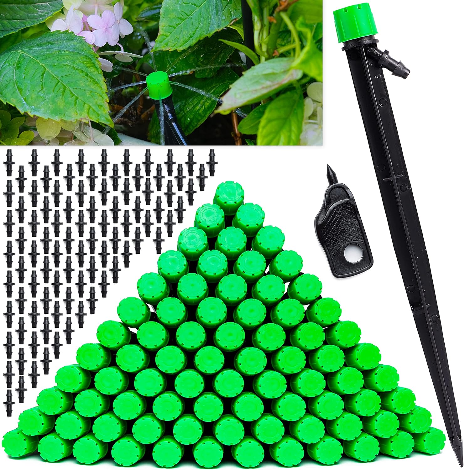 Conviértase en un maestro jardinero con la ayuda de nuestro kit de emisores de riego por goteo superiores y ajustables: 12 x emisores de goteo para tubo de riego por goteo de 1/4 + 12 x acoplamiento remachado de 1/4" para fácil conexión + 12 cabezales de aspersor de riego adicionales para cambiar el patrón de riego según desee + Punzón mini de 1/4" extra para perforar la línea de goteo de 1/2 pulgada + 1 x Guía de instrucciones completa en copia impresa