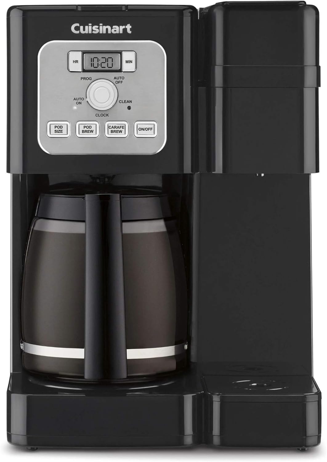 Get the best of both worlds with the dual brew options of Cuisinart's Coffee Center Brew Basics. The fully programmable coffeemaker lets you choose the amount you brew with -a full-service option that makes 12 fresh cups in a glass carafe and a single-serve side that brews 8-, 10-, and 12-oz sized cups in minutes (compatible with any single-cup pod, including Keurig's K-Cup). Whether you are hosting at home and need to serve multiple cups of coffee quickly or just want to brew a cup for yourself with minimal mess, our Coffee Center Brew Basics is here to deliver. Maximize the counter space in your kitchen with Cuisinart's answer to all your coffee needs; this two in one solution is your go-to for the freshest, most delicious coffee!
