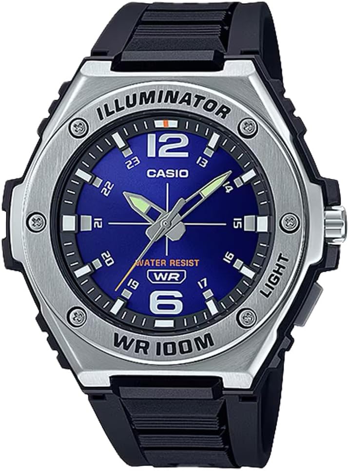 Casio MWA100H Series | Reloj Analógico para Hombre | 100M WR | Bisel de Acero Inoxidable | Retroiluminación LED con Afterglow | Correa de Resina | 3 Manillas (HR, MIN, SEC) | Batería de 3 años