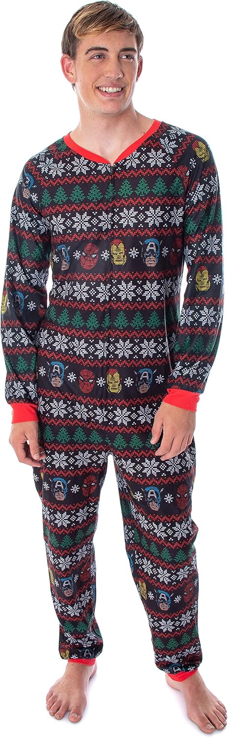 This one-piece pajama set is an Marvel product!! If you're a fan of Marvel Comics and especially holiday style comic designs, you're going to love this Avenger merchandise!. This vintage character union suit feature an allover ugly sweater design that incorporates 3 of the most popular Marvel heroes face designs, Captain America, Iron Man, and Spiderman with the classic holiday ugly sweater designs like the Christmas Trees and snowflakes. This is a one-of-a-kind product any Marvel fan is sure to love!! It has a full-zip design with contrasting red sleeve and ankle cuffs. It is made of an ultra-soft, smooth 100% polyester fabric. Listed in Men's sizing but will fit women great who are looking for a looser fit. The model in this photo is 6'4" and is wearing a size L/XL. These are the best!