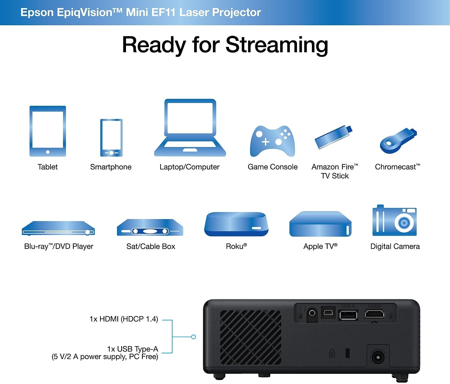 Go Epic!Enjoy an epic viewing experience virtually anywhere with the Epson EpiqVision Mini EF11 Laser Projector. With a built-in high-quality speaker system, this all-in-one projector is the perfect way to watch all your favorite streaming services. Simply connect your preferred streaming solution such as an Apple TV, Roku, Amazon Fire TV, or Android TV to the built-in HDMI port and you’re ready to start streaming (1) your favorite content up to an epic 150" — no screen required.The Epson EpiqVision Mini EF11 Laser Projector takes the complexity out of watching your favorite content anywhere in your home.1. Requires wireless network connection of 5 Mbps or faster. Some apps require paid subscriptions.2. For convenient and reasonable recycling options, visit our official site.3. SmartWay is an innovative partnership of the U.S. Environmental Protection Agency that reduces greenhouse gases and other air pollutants and improves fuel efficiency.